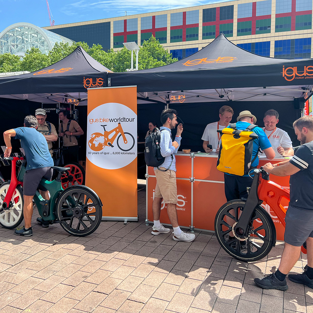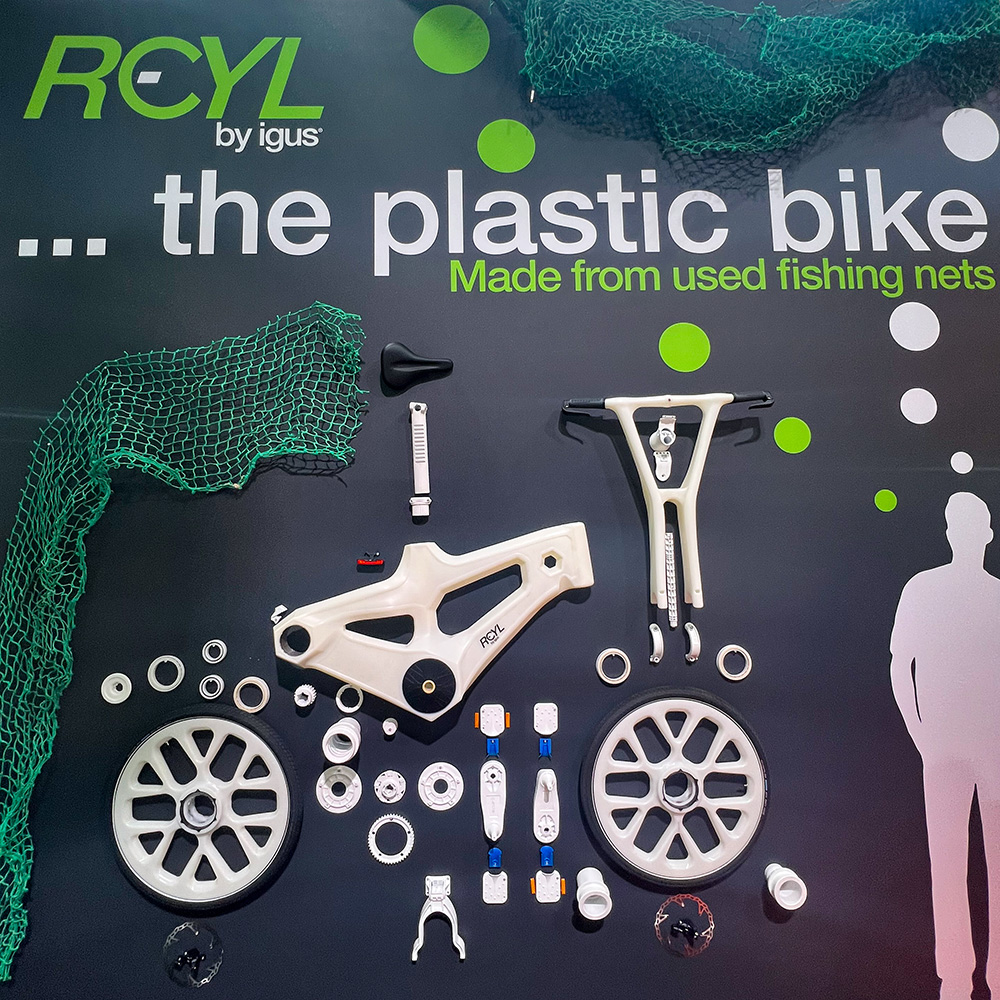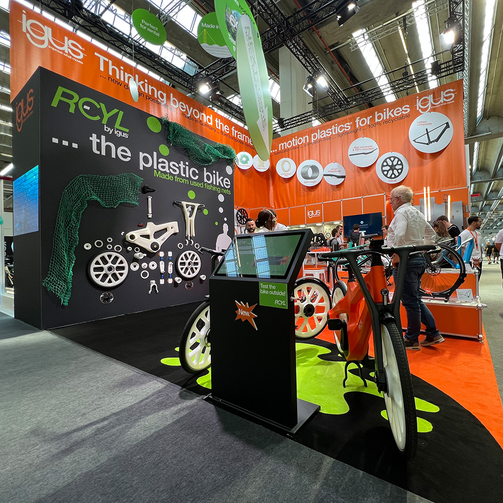 Auch innerhalb der Messehallen hatten wir wieder zusammen mit igus (der Firma hinter RCYL) einen Stand, auf dem sowohl der E-Bike-Prototyp als auch das RCYL ohne Motor bestaunt werden konnten. Und diesmal konnte unser Fahrrad nicht nur von außen betrachtet und angefasst werden: Jedes einzelne Bauteil war an der Wand vom Messestand befestigt, sodass man sehen konnte, dass unser Fahrrad fast ausschließlich aus Kunststoff besteht! Aktuell verwenden wir 50 % recycelten Kunststoff, unser nächstes Ziel sind 60 %. Unsere Materialentwickler sind fleißig dabei, dieses Ziel bald Wirklichkeit werden zu lassen.