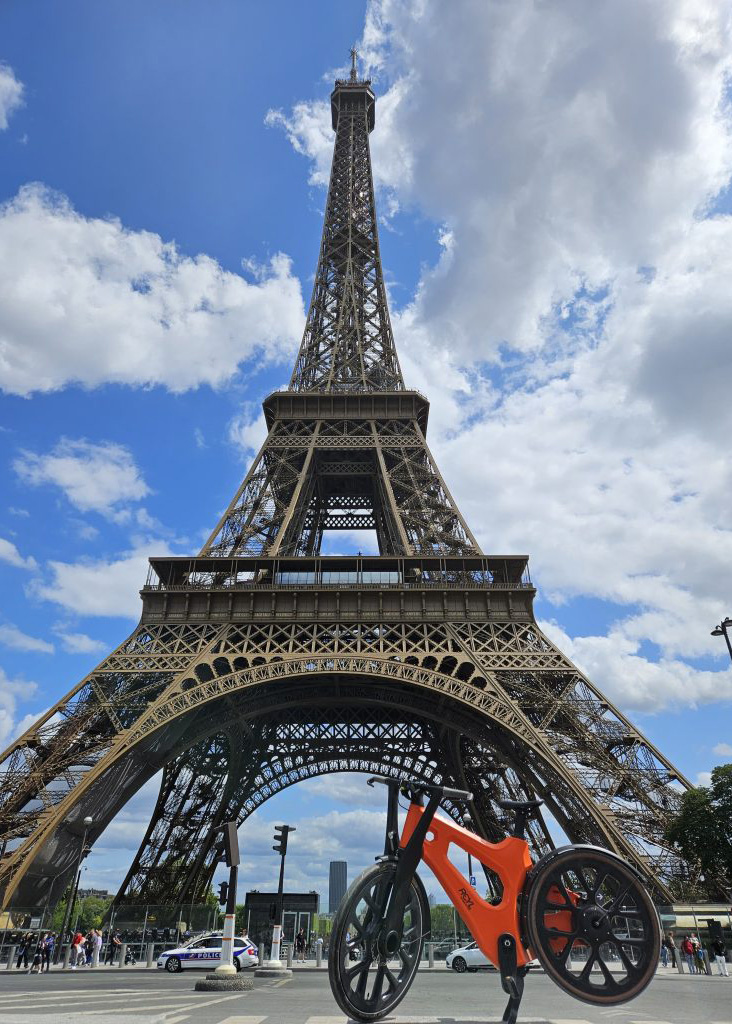 Und dann kommt der absolute Höhepunkt: die Abfahrt zum Trocadero und das große Finale unter dem Eiffelturm. Abendsonne, Kopfsteinpflaster, die schlanke Silhouette des Fahrrads und der metallische Glanz der „Eisernen Lady“ – Gänsehaut pur! Ein besserer Abschluss für den ersten Tag wäre kaum denkbar.