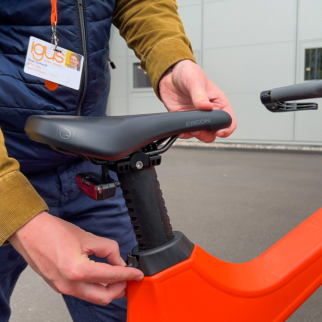 Die nächste Neuerung ist direkt ein absolutes Highlight: Die innovative Sattelstütze kommt jetzt mit einem Schnellspanner, der – bis auf eine Feder – vollständig aus Kunststoff besteht. So lässt sich die Sattelhöhe blitzschnell in 20 Positionen für Personen mit einer Körpergröße von 1,65 m bis 1,90 m einstellen.