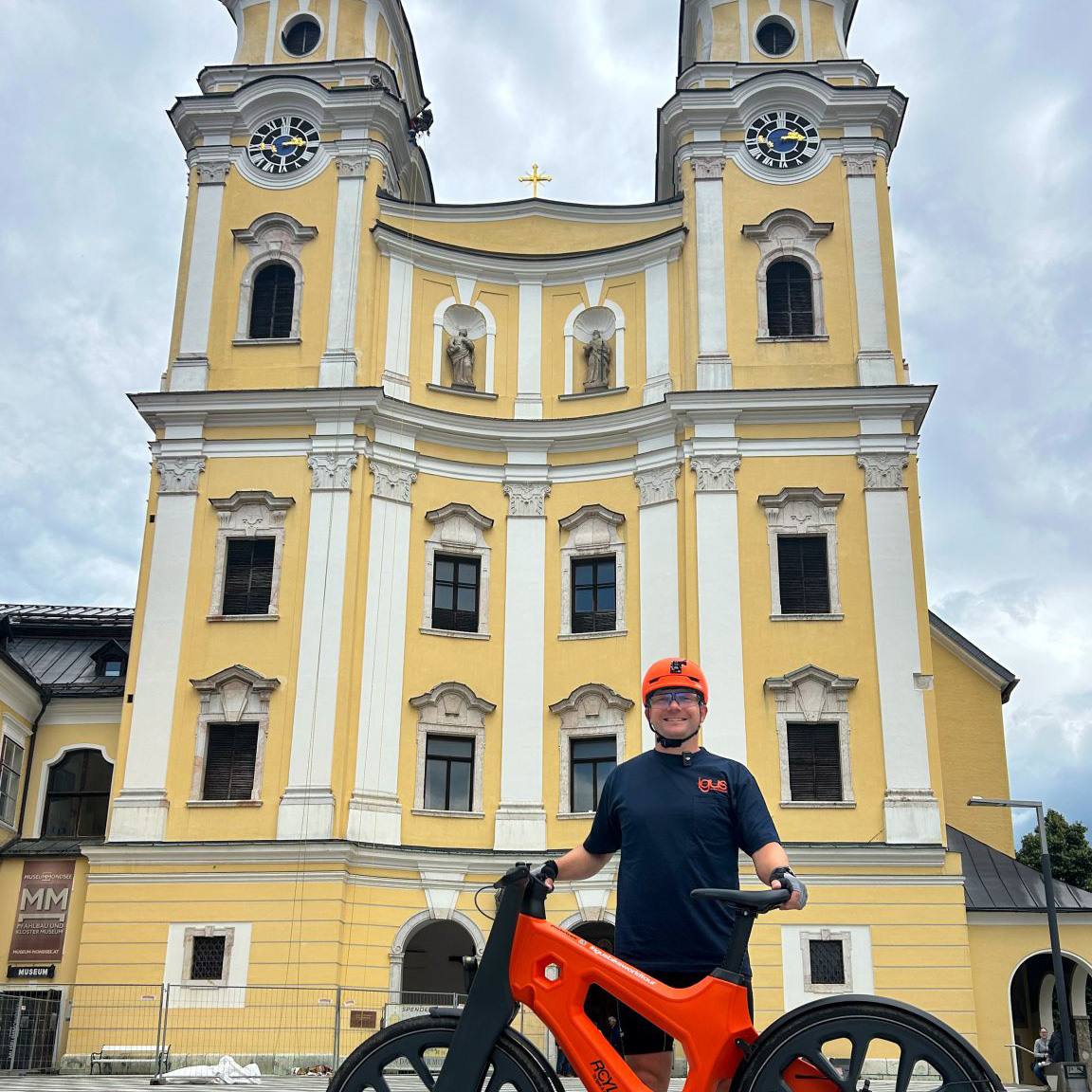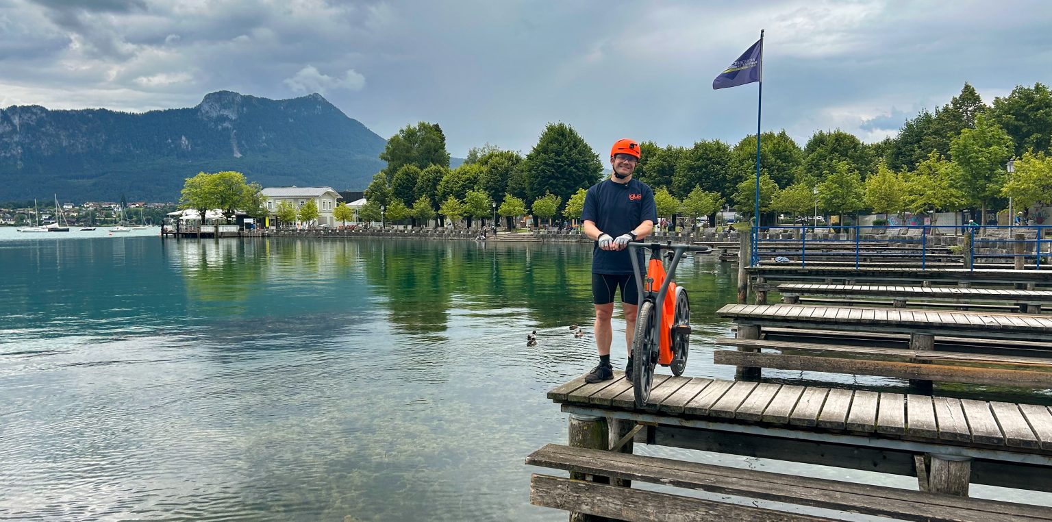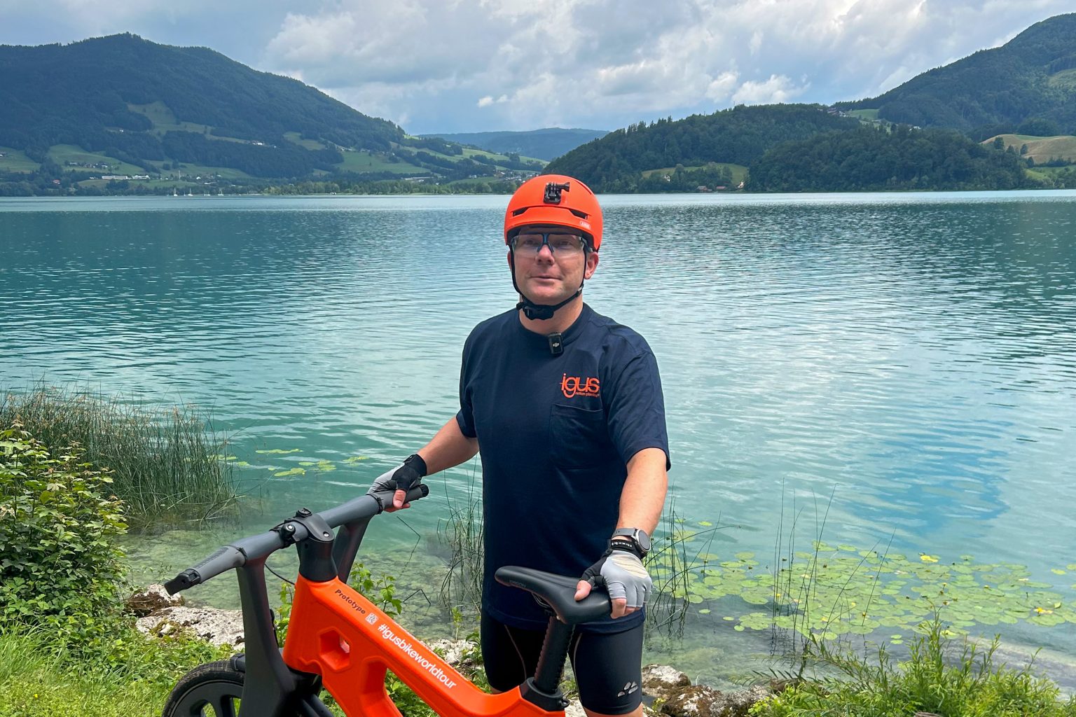 Heute stellt sich Andreas Roither, technischer Vertriebsmitarbeiter für e-chains® und Kabel in Oberösterreich und Salzburg, einer ganz besonderen Herausforderung: Der komplette Mondsee wird mit dem igus:bike umrundet. Die malerische Tour verbindet atemberaubende Natur, facettenreiche Kultur und pure Fahrradfreude – Start- und Zielpunkt ist die idyllische Seeache-Brücke.